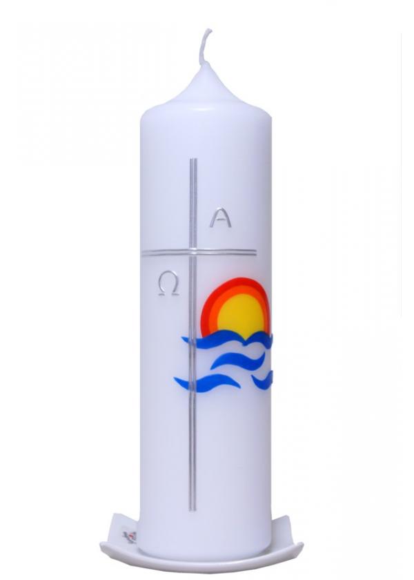 Die Taufkerze "Sonnenaufgang" ist verziert mit einem großen, silberfarbenen Kreuz. Auf der rechten Seite des Kreuzes wird ein Sonnenaufgang über dem Meer dargestellt. Der Sonnenaufgang steht immer für einen Anfang. Außerdem symbolisiert Licht auch Hoffnung und Leben. Das Wasser rundet diese Symbolik ab, denn Wasser bedeutet Leben. Die Buchstaben Alpha und Omega stehen zudem ebenfalls essenziell für das Christentum.