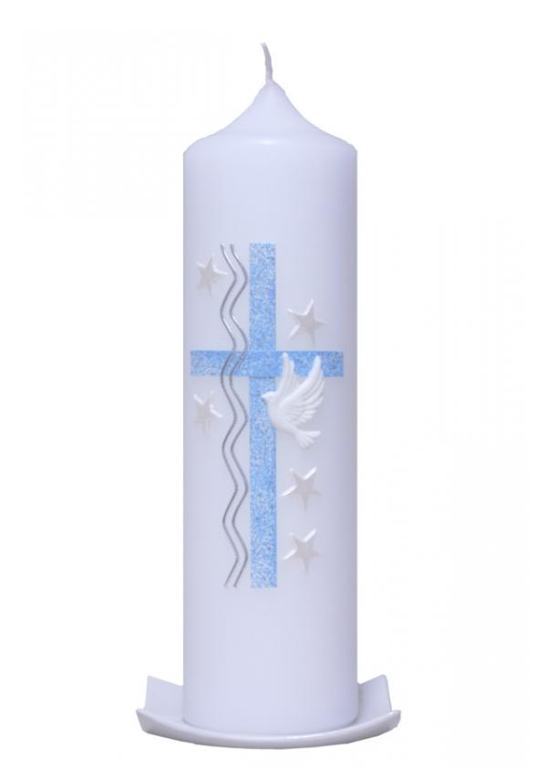 Bestellen Sie sich jetzt die Taufkerze "Traum" in der Farbe Hellblau und sorgen Sie so für einen Blickfang anlässlich der Taufe Ihres Kindes oder Patenkindes. Die Taufkerze „Traum“ ist geschmackvoll und liebevoll gestaltet. Im Mittelpunkt der Kerze steht ein Kreuz aus breiten, hellblauen Wachsstreifen. Auf der linken Seite des Kreuzes steigen zwei Ranken empor, die wellenartig nach oben verlaufen. Auf der rechten Seite der Kerze symbolisiert die fliegende weiße Taube Frieden und Christlichkeit. Abgerundet wird das Gesamtbild mit kleinen, hellen Sternen.