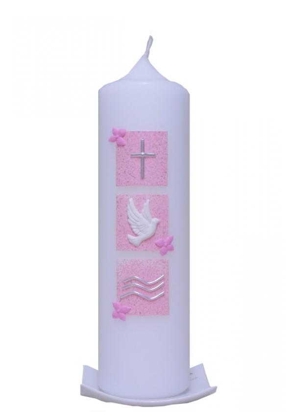 Die Taufkerze "drei Quadrate mit Blume" in der Farbe Rosa eignet sich hervorragend für die Taufe Ihrer Tochter oder Patentochter. Die Kerze zeigt die drei christlichen Symbole Wasser, Taube und Kreuz. Bei der Motivwahl ist die Kerze auf das Wesentliche reduziert und spricht den Betrachter durch klare Linien und klare Aussagen direkt an.